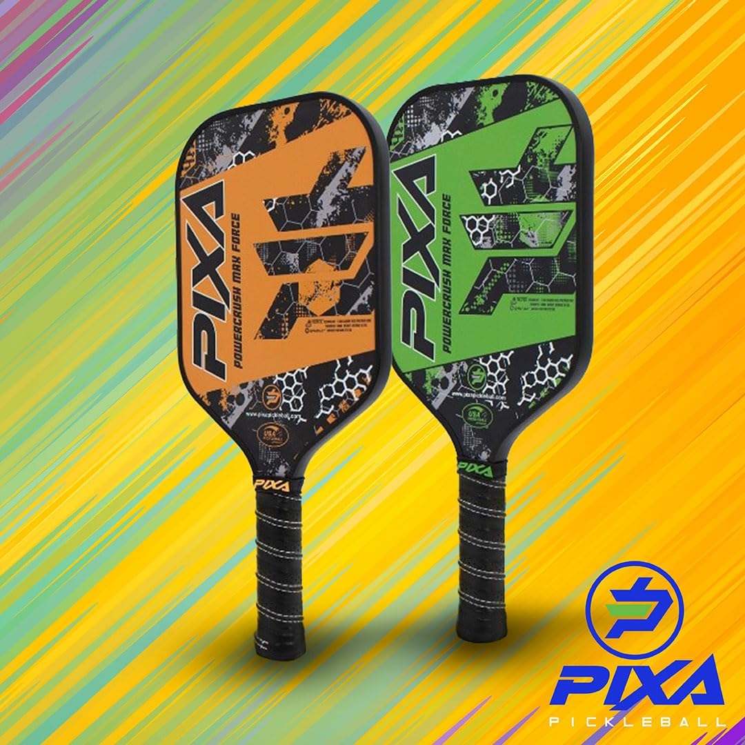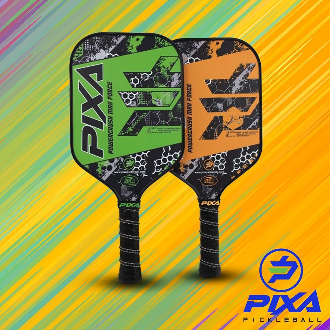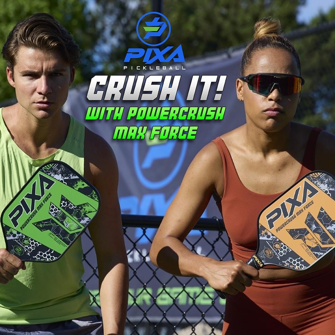 Ready to level up your pickleball game? Look no further than the Powercrush Max Force T-300 Pickleball Paddle Set from PIXA Pickleball! This awesome package includes not one, but two paddles, a water-resistant Oxford Cloth bag, 4 Yellow PIXA Velocity Pro 40 Pickleballs, and 2 cooling towels. It’s everything you need to dominate the court with style! What makes our paddles stand out? It’s all about technology. Our paddles are built with FiberFuse technology, a special process that combines the core and face materials to give you a solid paddle feel. But that’s not all! We’ve also integrated SpinMax Surface Friction Technology to give you unbelievable spin and precision on every shot. Say goodbye to weak hits and hello to powerful, accurate shots! Not only do our paddles perform at the highest level, but they also look fantastic. With vibrant colors and a sleek design, you’ll be the envy of every player on the court. And let’s not forget about the extra-long tennis handle, measuring a whopping 5.5 inches. It provides optimal grip and control, giving you the confidence to unleash your inner pickleball champion. But we’re not just about the game, we’re all about promoting a healthy and active lifestyle too. Pickleball is a sport for everyone, regardless of age or physical condition. It’s a great way to stay fit, have fun, and connect with others. That’s why our motto is “Pickleball for Everyone.” We’ve even added bright and exciting graphics to our paddles to elevate your mood and make every game memorable. So, what are you waiting for? Get your game on, feel the Max Force, and play with unbeatable power. Serve, smash, win, and repeat. With the Powercrush Max Force T-300 Pickleball paddle set from PIXA Pickleball, you’ll be unstoppable. But remember, always consult with your physician before starting any new physical activity. Feel the Max Force, Play With Power!