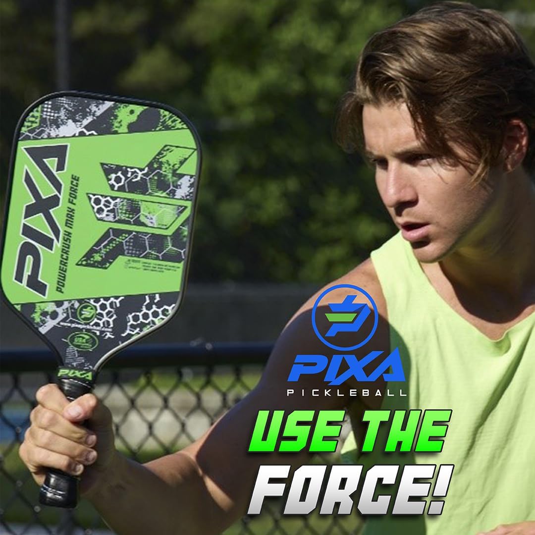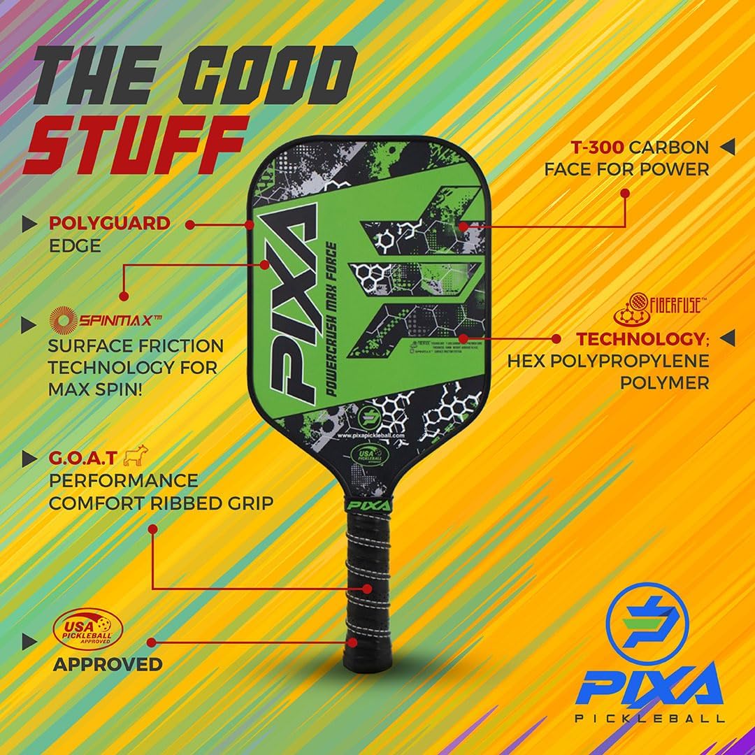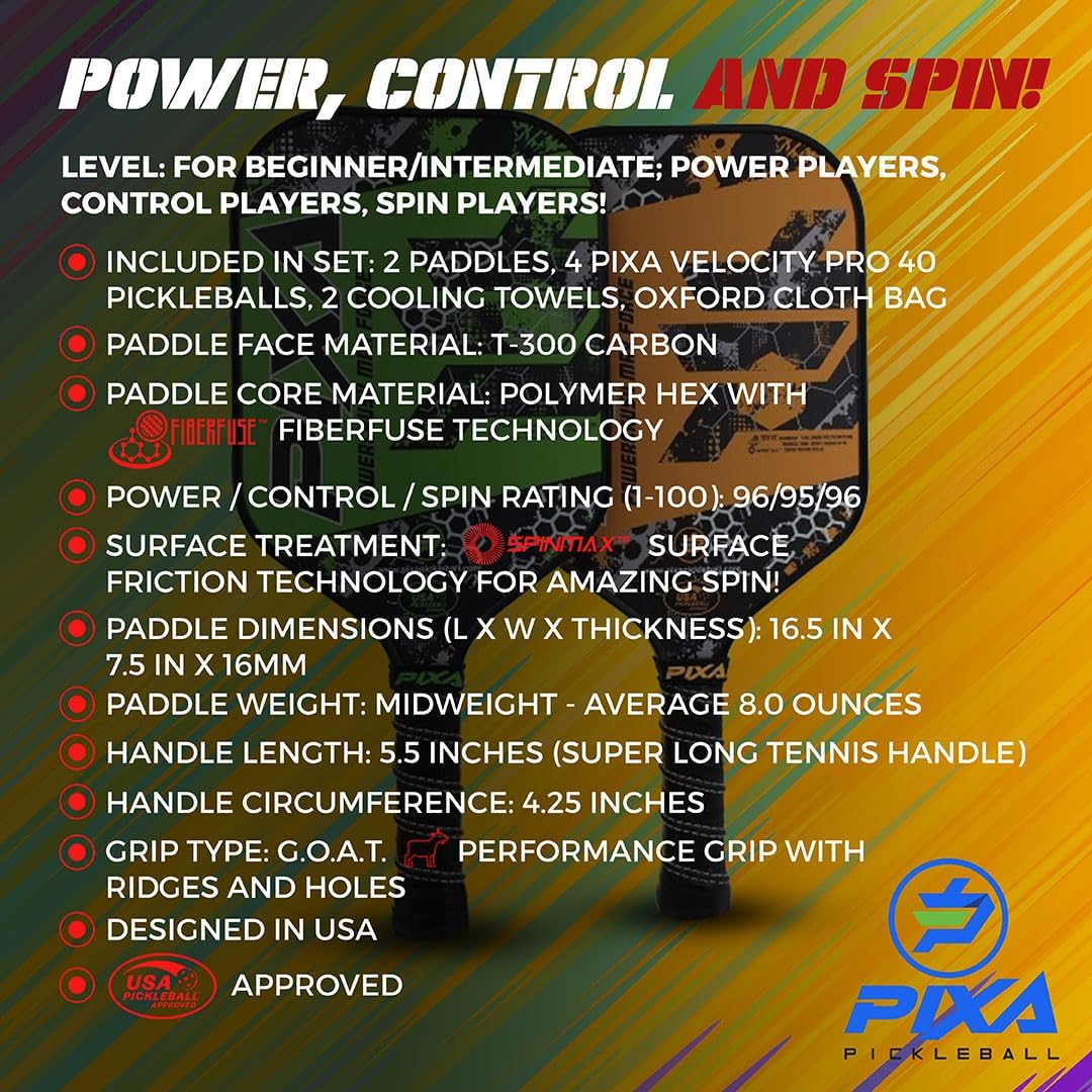 Ready to level up your pickleball game? Look no further than the Powercrush Max Force T-300 Pickleball Paddle Set from PIXA Pickleball! This awesome package includes not one, but two paddles, a water-resistant Oxford Cloth bag, 4 Yellow PIXA Velocity Pro 40 Pickleballs, and 2 cooling towels. It’s everything you need to dominate the court with style! What makes our paddles stand out? It’s all about technology. Our paddles are built with FiberFuse technology, a special process that combines the core and face materials to give you a solid paddle feel. But that’s not all! We’ve also integrated SpinMax Surface Friction Technology to give you unbelievable spin and precision on every shot. Say goodbye to weak hits and hello to powerful, accurate shots! Not only do our paddles perform at the highest level, but they also look fantastic. With vibrant colors and a sleek design, you’ll be the envy of every player on the court. And let’s not forget about the extra-long tennis handle, measuring a whopping 5.5 inches. It provides optimal grip and control, giving you the confidence to unleash your inner pickleball champion. But we’re not just about the game, we’re all about promoting a healthy and active lifestyle too. Pickleball is a sport for everyone, regardless of age or physical condition. It’s a great way to stay fit, have fun, and connect with others. That’s why our motto is “Pickleball for Everyone.” We’ve even added bright and exciting graphics to our paddles to elevate your mood and make every game memorable. So, what are you waiting for? Get your game on, feel the Max Force, and play with unbeatable power. Serve, smash, win, and repeat. With the Powercrush Max Force T-300 Pickleball paddle set from PIXA Pickleball, you’ll be unstoppable. But remember, always consult with your physician before starting any new physical activity. Feel the Max Force, Play With Power!